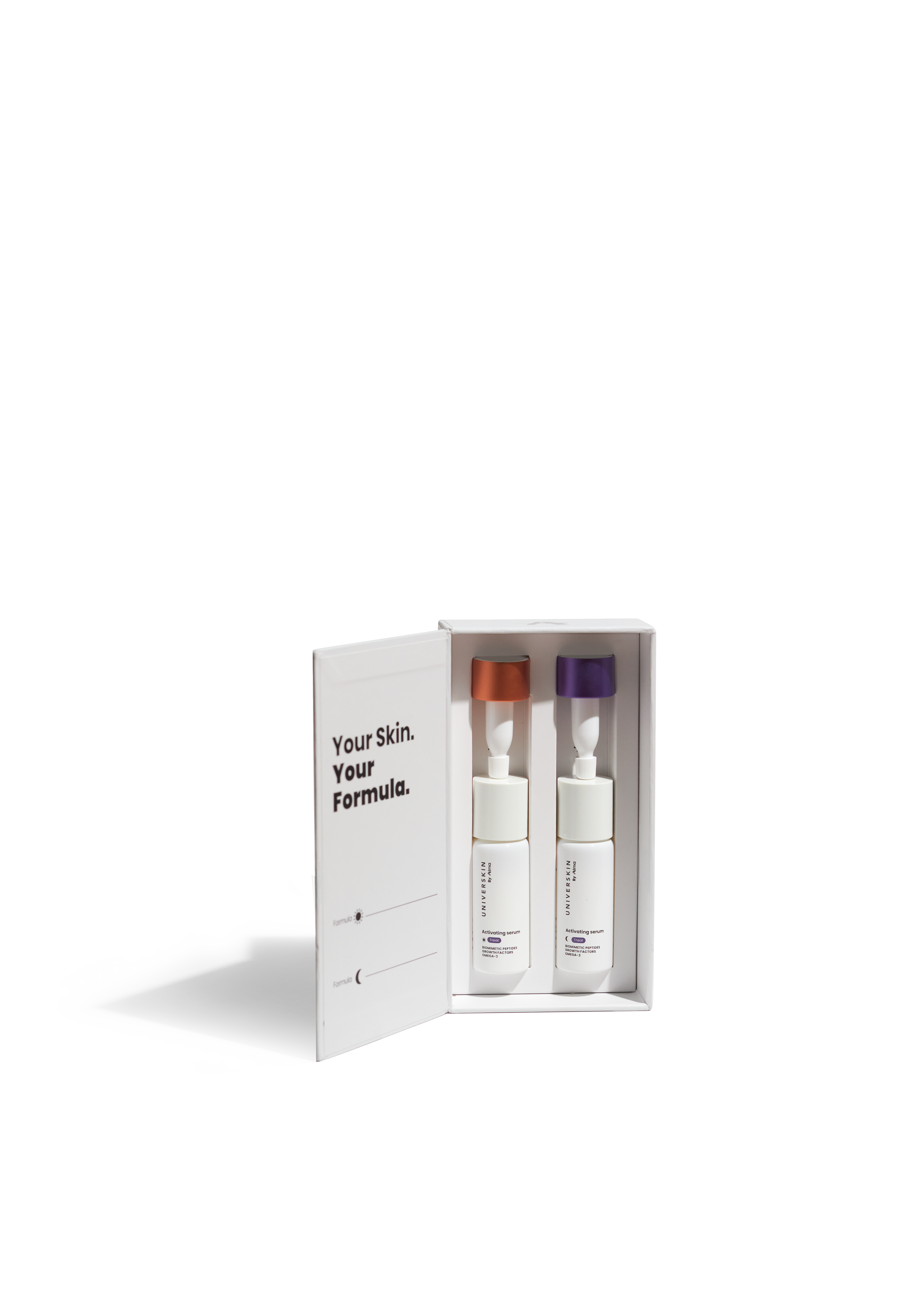 Universkin by Alma日間和夜間活性精華液,以四種專有勝肽和Omega-3脂肪酸的獨特混合物,是一款結合個人專屬配方、專利抗炎成份及多種高效物質的多用途精華。當中個人化配方組合超過180萬種,坊間護膚品無法比擬。 憑藉其專利配方,質地輕盈乳化,易於吸收,帶來奢華的護膚體驗。單獨使用,活性精華液的保存期限為2年。亦可依需要混合活性成份,僅在顧客購買時才進行配製。每瓶最多可添加3種活性成份,加強修護能力。成份不含防腐劑,需在4個月內使用。使用方法按壓瓶蓋,取4滴精華液塗抹於清潔的臉部,然後用輕柔的圓形按摩手法按摩吸收。